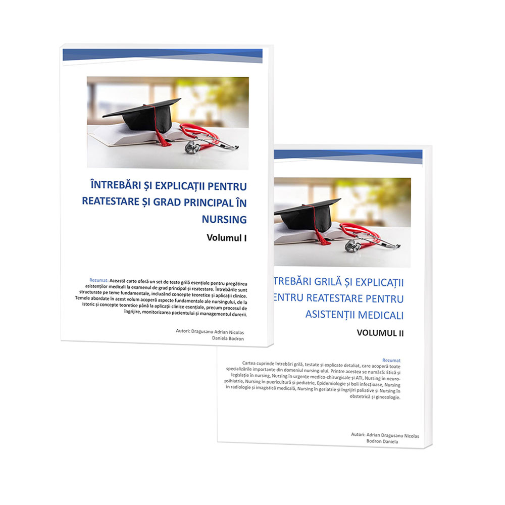 Pachetul „Întrebări Grilă și Explicații pentru Reatestare” este un ghid complet destinat asistenților medicali care doresc să își actualizeze cunoștințele și să se pregătească eficient pentru examenul de reatestare. Cele două volume sunt structurate astfel încât să acopere atât fundamentele teoretice ale nursing-ului, cât și cerințele specifice pentru reatestare, ajutându-i pe asistenți să își consolideze competențele și să își îmbunătățească performanțele profesionale.